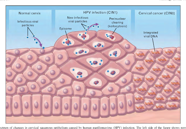 | שלבי ההדבקה של הוירוס, בצד השמאלי רקמת אפיתל בצוואר הרחם לפני הדבקה, באמצע רקמת אפיתל בשלבים הראשונים לאחר הדבקה עם נגע טרום סרטני ברמה נמוכה, ובצד הימני סרטן צוואר הרחם. |