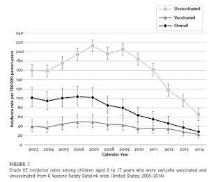 | בתמונה: אחד מהגרפים במחקר שמראה את ההבדל העצום בין מחוסנים ללא מחוסנים בהופעה של שלבקת חוגרת אצל ילדים מגילאים 0 עד 17 שנים |