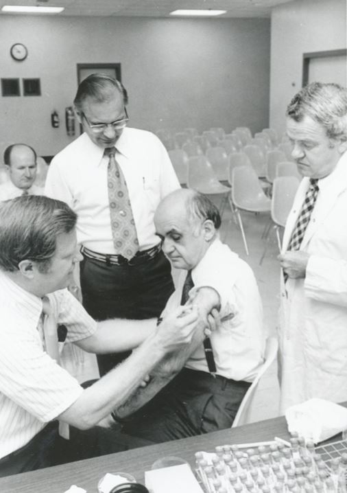| Maurice Hilleman בודק על עצמו את חיסון הפלסמה החדש שפיתח נגד צהבת B עוד לפני שהתחילו המחקרים הקליניים. |